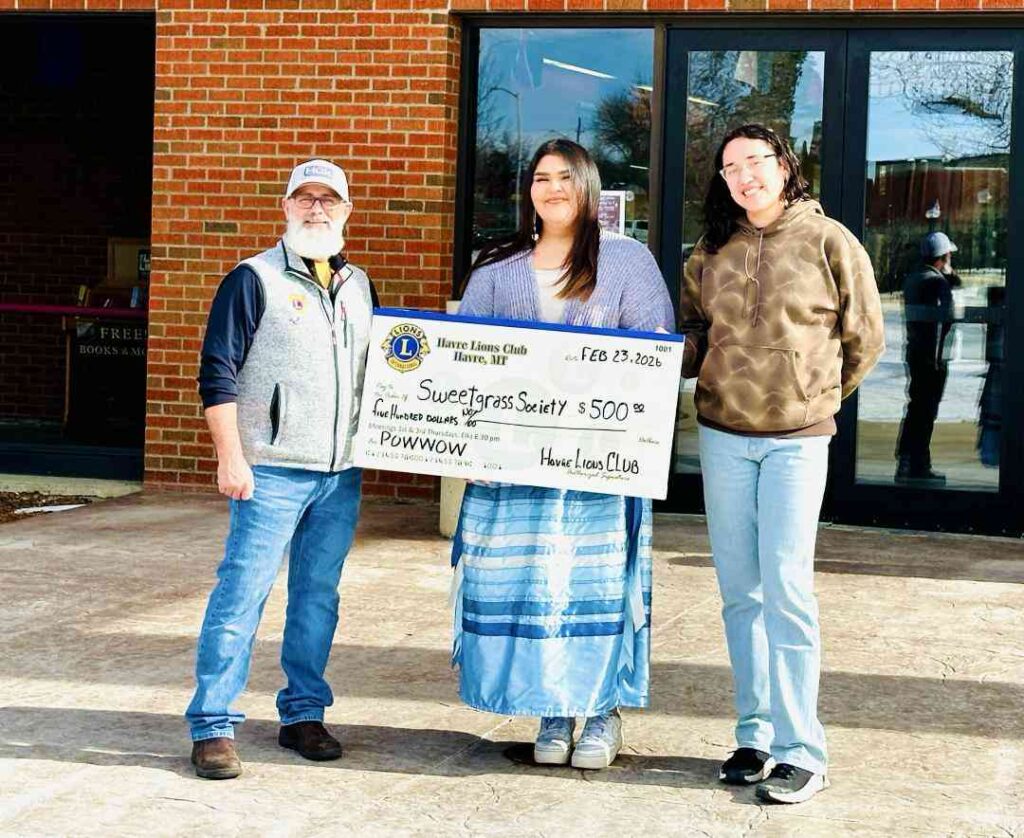 Havre Lions’ President Russ Stinnett presented a check for $500 to MSU Northern Sweet Grass Society to help support their 49th Annual Pow Wow.